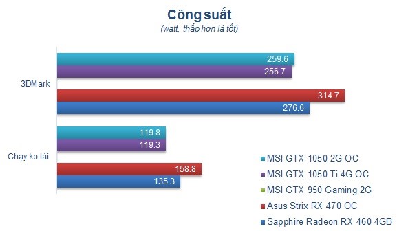 - Nếu so với mẫu card Sapphire Nitro RX 460 OC và Asus Strix RX 470 mình thử nghiệm gần đây thì GTX 1050 và 1050 Ti có mức tiêu thụ năng lượng thấp hơn khoảng 20W. Điều này cũng phần nào thể hiện ưu thế của kiến trúc đồ họa Pascal được phát triển nhằm cải thiện mức tiêu thụ điện năng trong khi vẫn đạt được hiệu suất như mong muốn.