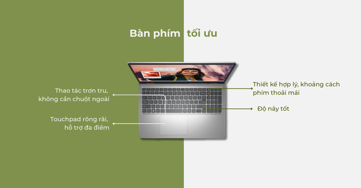 Bàn phím thiết kế hợp lý, khoảng cách phím thoải mái, độ nảy tốt, giúp người dùng gõ văn bản nhanh chóng và chính xác. Touchpad rông rãi, hỗ trợ đa điểm, giúp thao tác trơn tru mà không cần chuột ngoài.