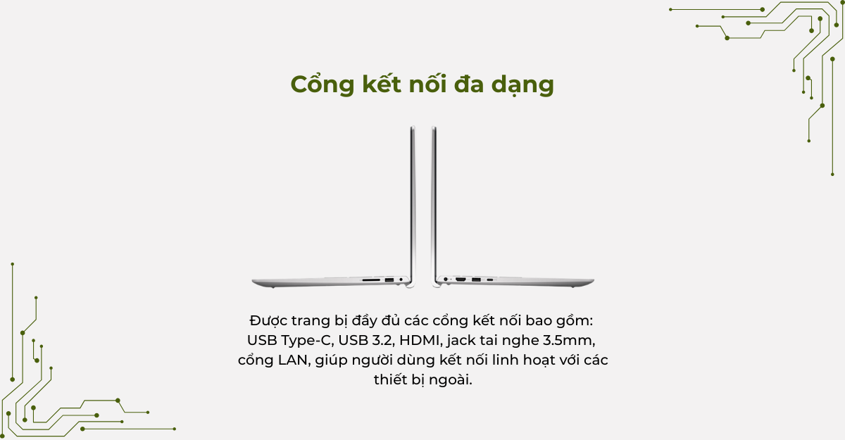 Laptop được trang bị đầy đủ các cổng kết nối bao gồm: USB Type-C, USB 3.2, HDMI, jack tai nghe 3.5mm, cổng LAN, giúp người dùng kết nối linh hoạt với các thiết bị ngoài.