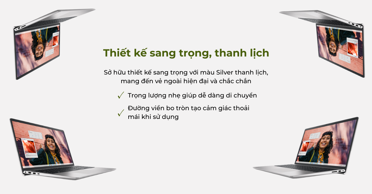 Dell Inspiron 15 3530 sở hữu thiết kế sang trọng với màu Silver thanh lịch, mang đến vẻ ngoài hiện đại và chắc chắn. Khung máy được gia cố tốt, các đường viền bo tròn tạo cảm giác thoải mái khi sử dụng. Trọng lượng khá nhẹ giúp người dùng dễ dàng mang theo khi di chuyển.