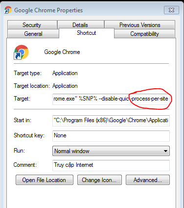 Bước 3: Sau khi bảng Properties hiện ra, bạn chọn sang tab Shortcut. Ở ô Target, bạn kéo xuống tới điểm cuối sau đó thêm –process-per-site vào.