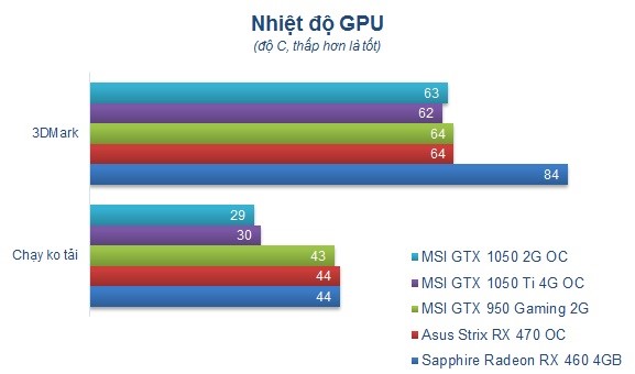 - Nếu so với mẫu card Sapphire Nitro RX 460 OC và Asus Strix RX 470 mình thử nghiệm gần đây thì GTX 1050 và 1050 Ti có mức tiêu thụ năng lượng thấp hơn khoảng 20W. Điều này cũng phần nào thể hiện ưu thế của kiến trúc đồ họa Pascal được phát triển nhằm cải thiện mức tiêu thụ điện năng trong khi vẫn đạt được hiệu suất như mong muốn.